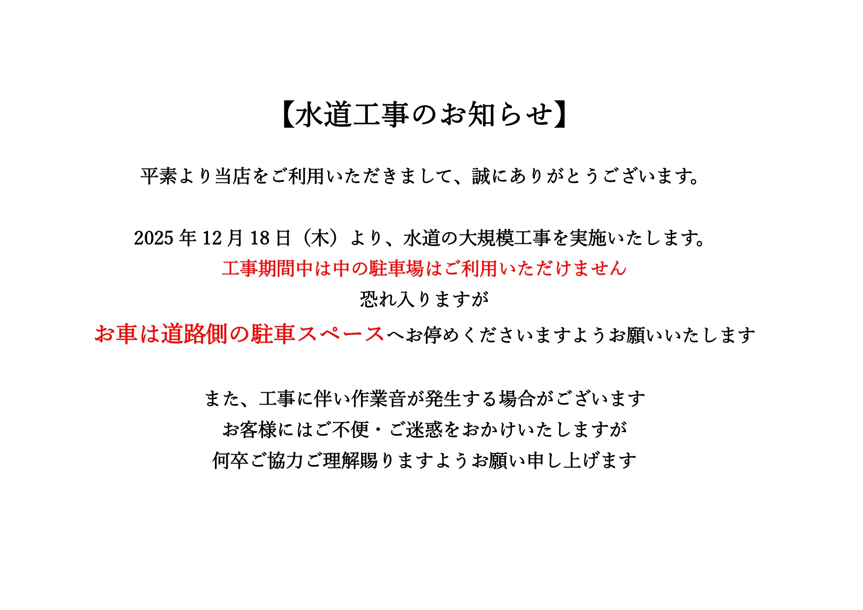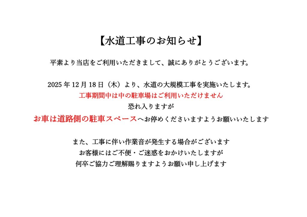 2025 年 12 月 18 日(木)より、水道の大規模工事を実施いたします。